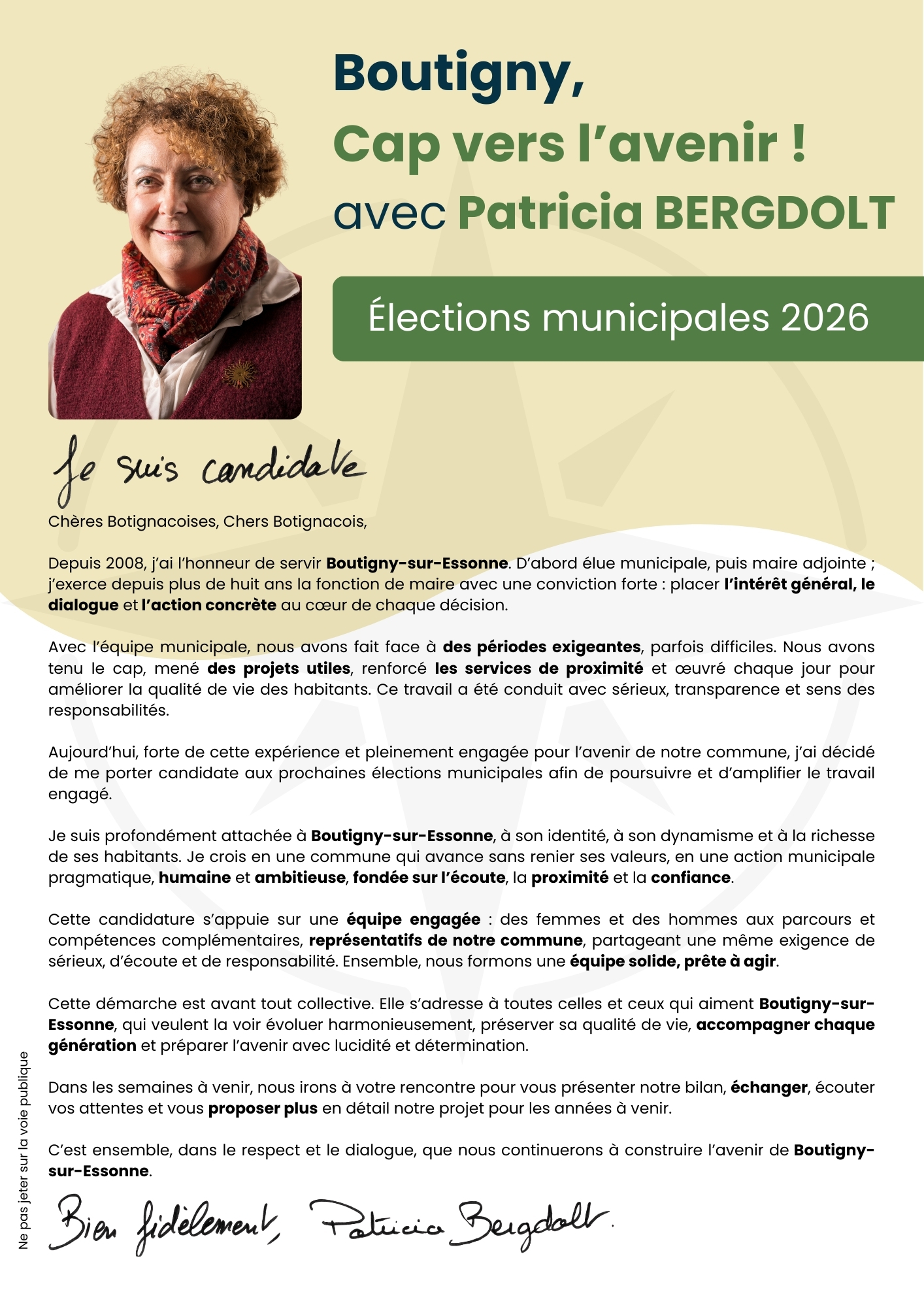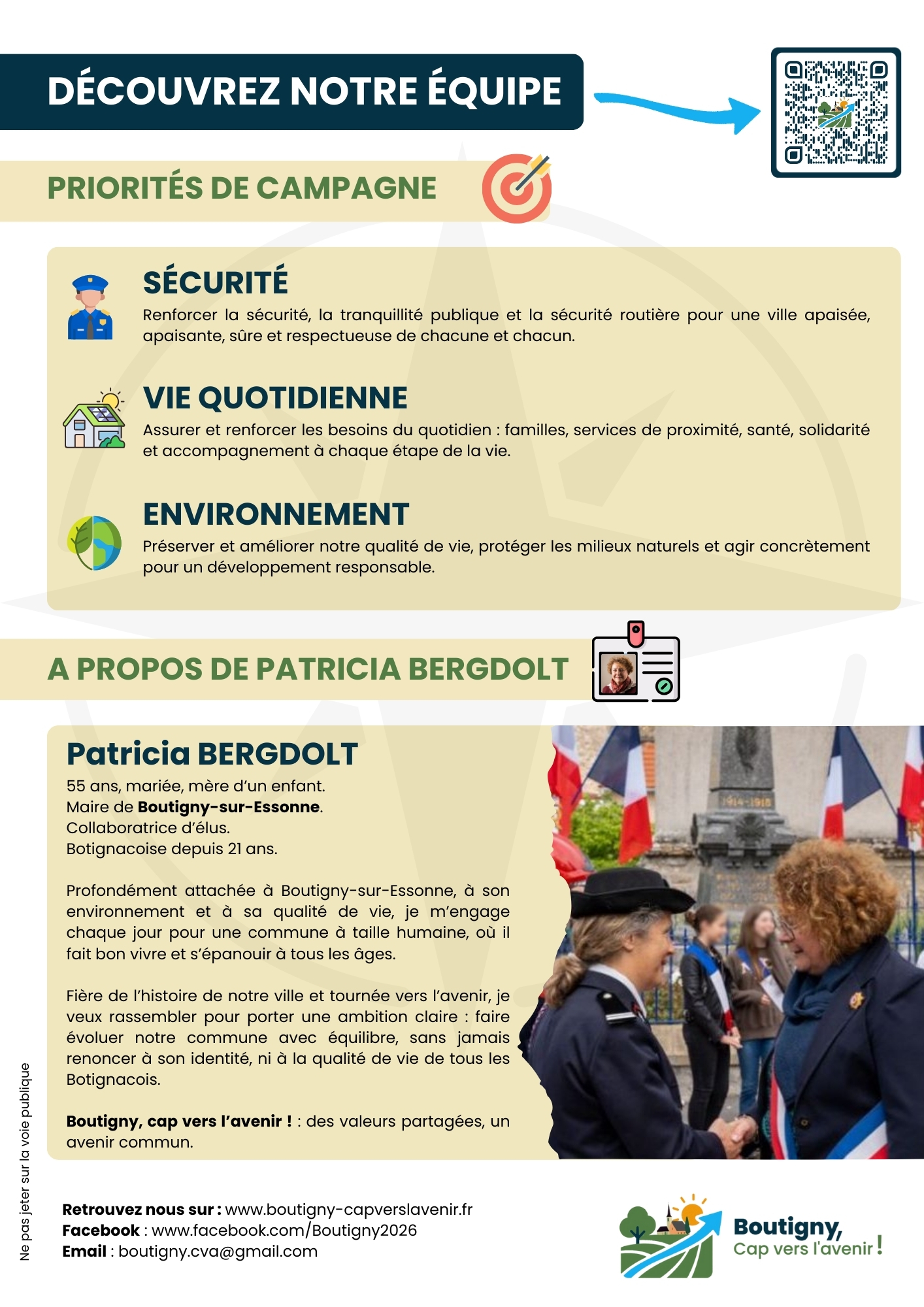 Fière de l’histoire de notre ville et tournée vers l’avenir, je veux rassembler pour porter une ambition claire : faire évoluer notre commune avec équilibre, sans jamais renoncer à son identité, ni à la qualité de vie de tous les Botignacois.